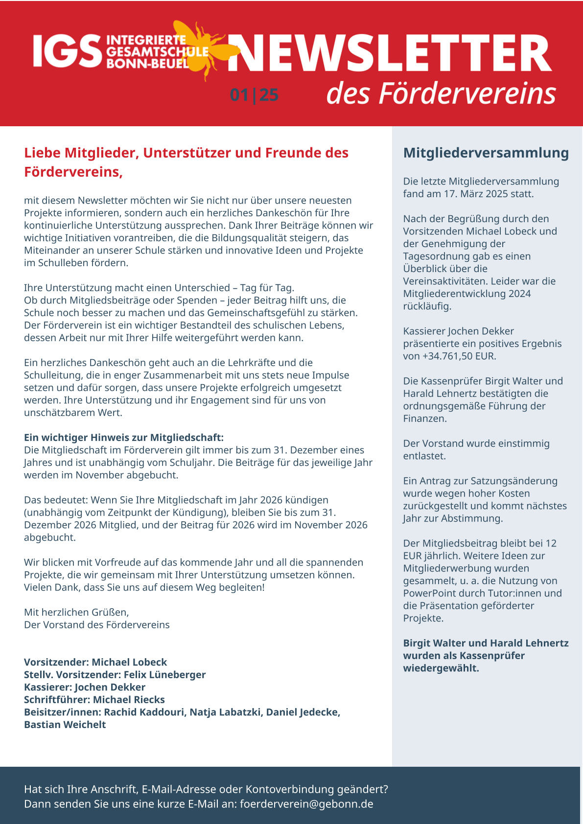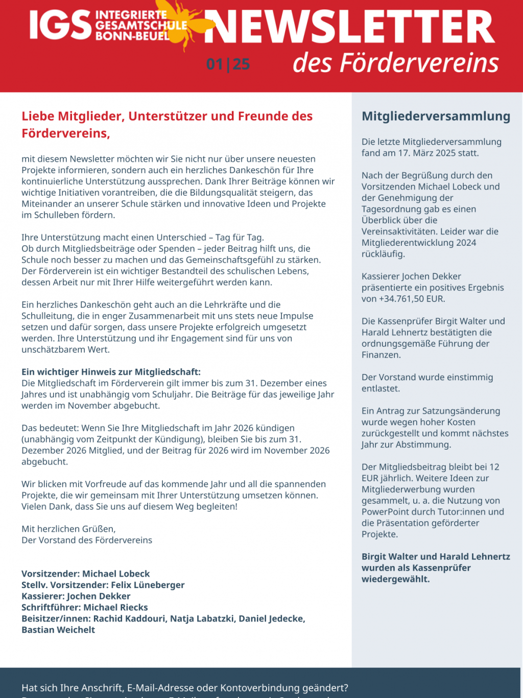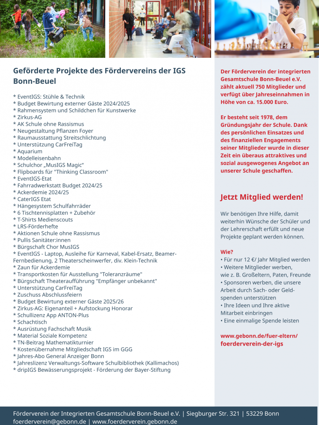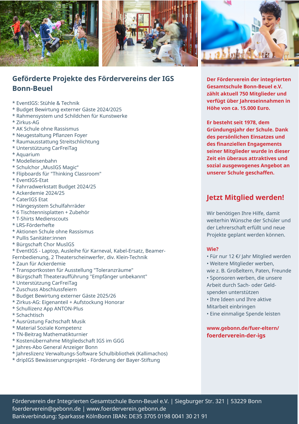 Der Förderverein der integrierten Gesamtschule Bonn-Beuel zählt derzeit fast 750 Mitglieder und verfügt über Jahreseinnahmen in Höhe von ca. 15.000 Euro. Er besteht seit 1978, dem Gründungsjahr der Schule. Dank des persönlichen Einsatzes und des finanziellen Engagements seiner Mitglieder wurde in dieser Zeit ein überaus attraktives und sozial ausgewogenes Angebot an unserer Schule geschaffen.