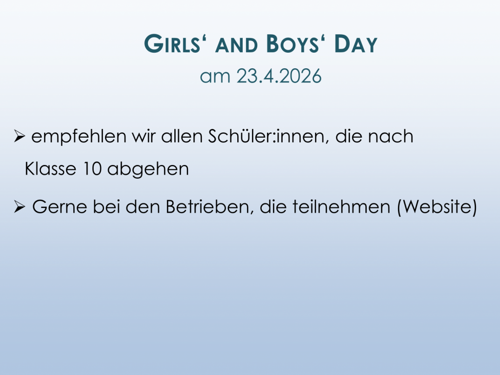 Die berufliche Orientierung beginnt bereits in der Schule und gezielte Förderangebote unterstützen den Übergang. Wir beginnen damit ab dem Jahrgang 07 mit dem Girls' and Boys' Day. Genauere Informationen befinden sich bei den Jahrgangsübersichten.