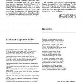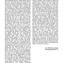Die interessantesten und zeitgenössischsten Themen haben wieder einmal in ausreichender Menge ihren Weg in die Redaktion gefunden, so dass sie hier nun sortiert und gefiltert in gebündelter Macht auf ihrem Schoß ruhen. Der wunderbare Eyecatcher von Titelbild dieser Ausgabe wurde von Hailey Daufenbach beigesteuert, welcher in harmonischster Art und Weise neugierig auf den Inhalt macht. Hier sind erwähnenswert wohl vor allem der literarisch in diesen Schulmauern einzigartige Walpurgisnacht-Traum, welcher von Nicklas Lange, einem unserer alteingesessensten Redakteure verfasst wurde, sowie der zeichnerisch wie schriftlich brillante Comic „Okay“, von Theresa Oczkowicz. Unter eben angesprochenen Schulmauern kam noch ein Artikel zustande. Denn der alte Bunker, welcher an dieser Schule schon Stoff für einige Legenden bot, eignet sich einfach perfekt für alljährliche Reportagen. Für die jüngere Leserschaft existieren außerdem noch Artikel über die Assistenzhunde, sowie über den Schulacker, welchen anscheinend unser modernes Zeitalter eingeholt hat.
