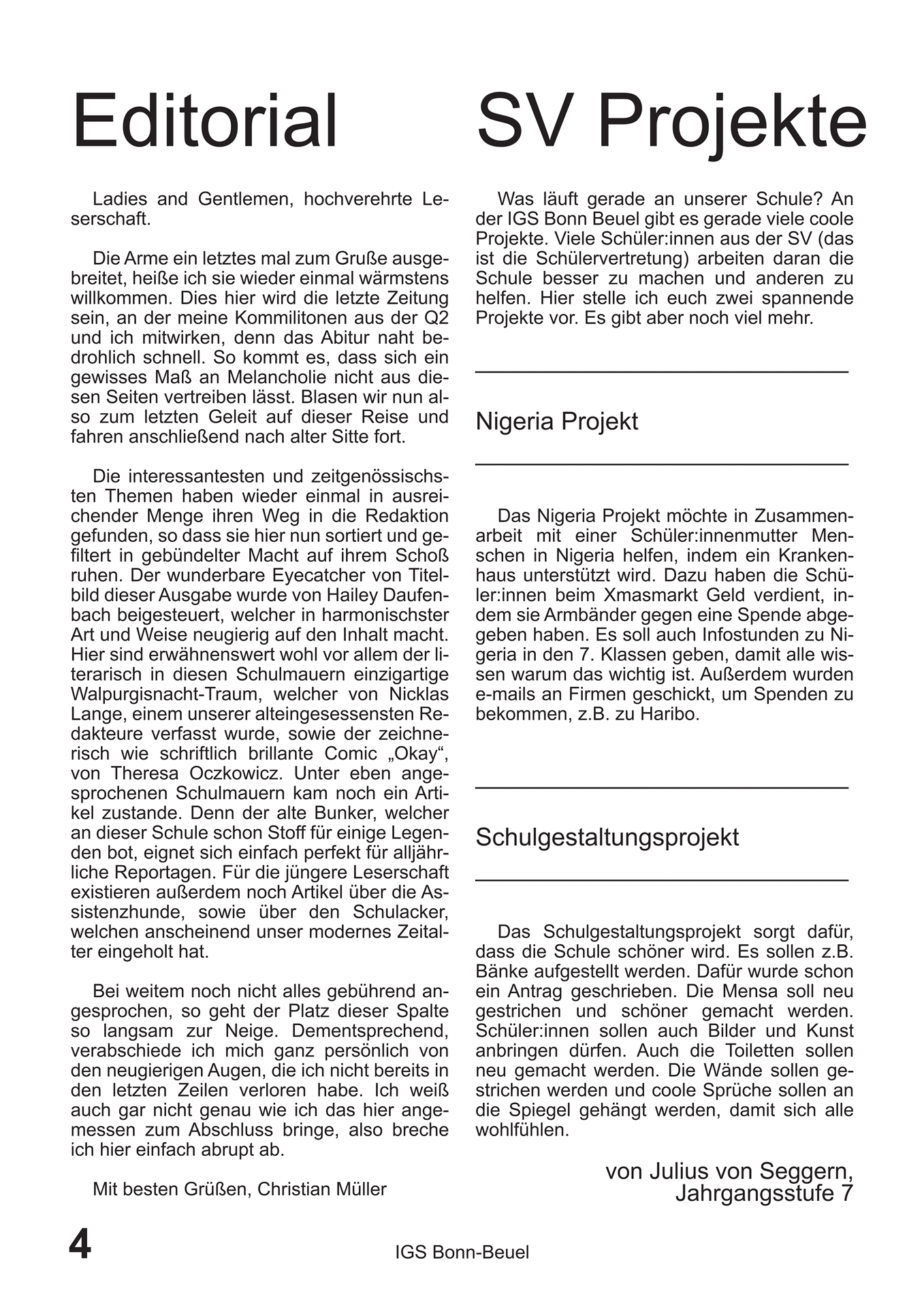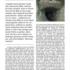 Die Arme ein letztes mal zum Gruße ausgebreitet, heiße ich sie wieder einmal wärmstens willkommen. Dies hier wird die letzte Zeitung sein, an der meine Kommilitonen aus der Q2 und ich mitwirken, denn das Abitur naht bedrohlich schnell. So kommt es, dass sich ein gewisses Maß an Melancholie nicht aus diesen Seiten vertreiben lässt. Blasen wir nun also zum letzten Geleit auf dieser Reise und fahren anschließend nach alter Sitte fort.
