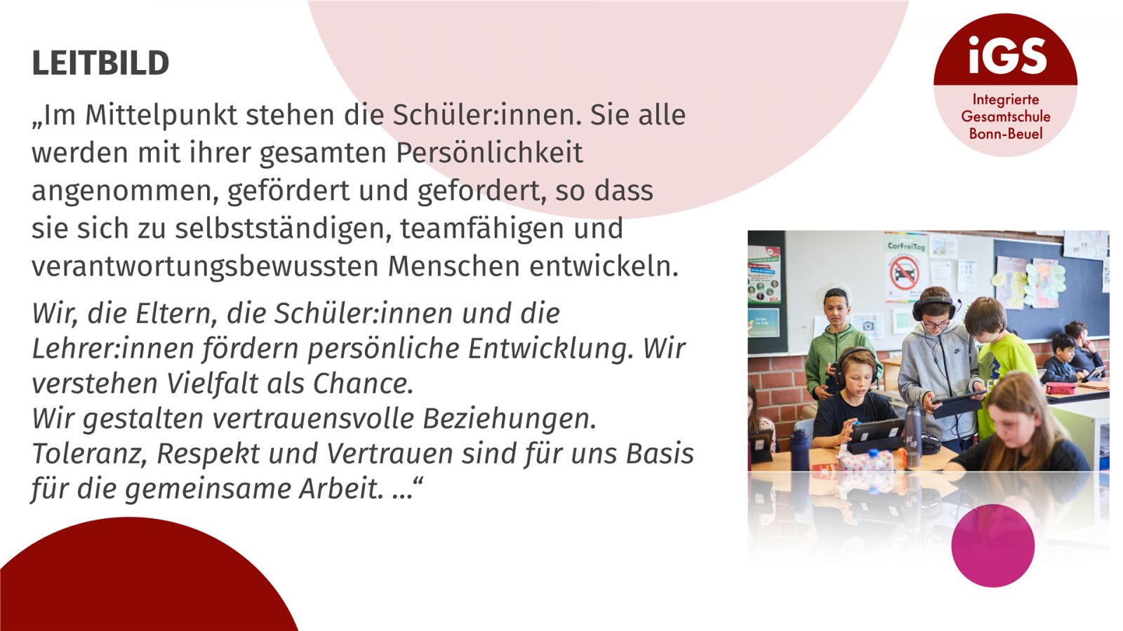 Im Mittelpunkt unserer schulischen Arbeit stehen unsere Schüler:innen, so dass es unser Anspruch ist, sie entsprechend ihrer individuellen Bedürfnisse mit vielfältigen Angeboten zu fördern und zu fordern. Alle Schüler:innen sollen nicht nur zu ihrem best- und höchstmöglichen Abschluss geführt werden, sondern auch und besonders in ihrem sozialen Handeln gestärkt werden. In diesem Sinne haben wir auch unser Leitbild "In Gemeinschaft stark" gewählt, mit dem wir beide Aspekte betonen: Wir möchten eine gute Schul- und Klassengemeinschaft fördern und eine demokratisch agierende, konstruktive und aktive Schulgemeinde bilden, die Basis für effektives Lernen und ein wertschätzendes Miteinander in unserer Schule ist. Das sehen wir als notwendige Grundlage, damit sich die IGS als Schule stetig weiterentwickeln und sich den Herausforderungen der Gegenwart und Zukunft stellen kann. In diesem Sinne ist dieses Schulprogramm "nur" die Darstellung eines Entwicklungstandes der schulischen Arbeit und der Angebote der IGS Bonn-Beuel. Es entwickelt sich, so wie die Schule selbst, stetig weiter und soll somit auch die Dokumentation eines Entwicklungsprozesses sein.