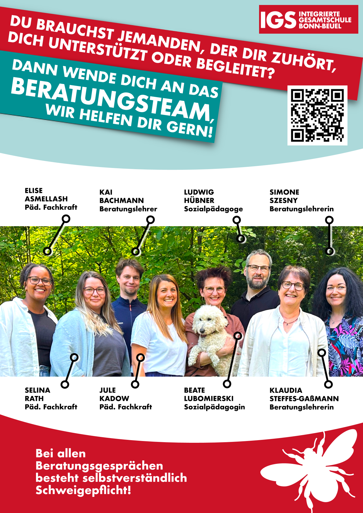 Das Beratungsteam der IGS Bonn-Beuel besteht aus zwei Schulsozialpädagog:innen und drei Beratungslehrer:innen. Wir treffen uns wöchentlich zu einer Teamsitzung zur Klärung und Koordination organisatorischer Belange im Beratungsfeld, zu Fallbesprechungen und zur Supervision. Bei allen Beratungsgesprächen besteht selbstverständlich Schweigepflicht. Die Abteilungsleitungen der jeweiligen Jahrgänge oder weitere Schulleitungsmitglieder nehmen nach Bedarf teil.