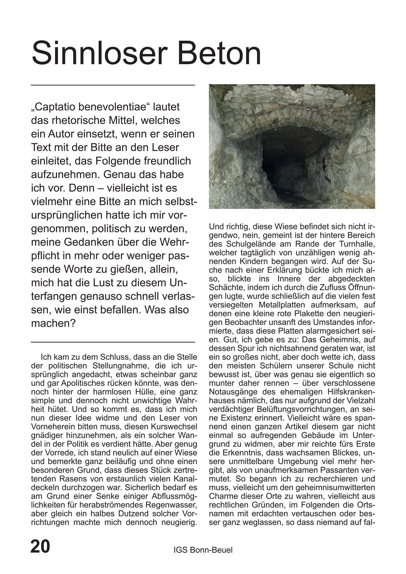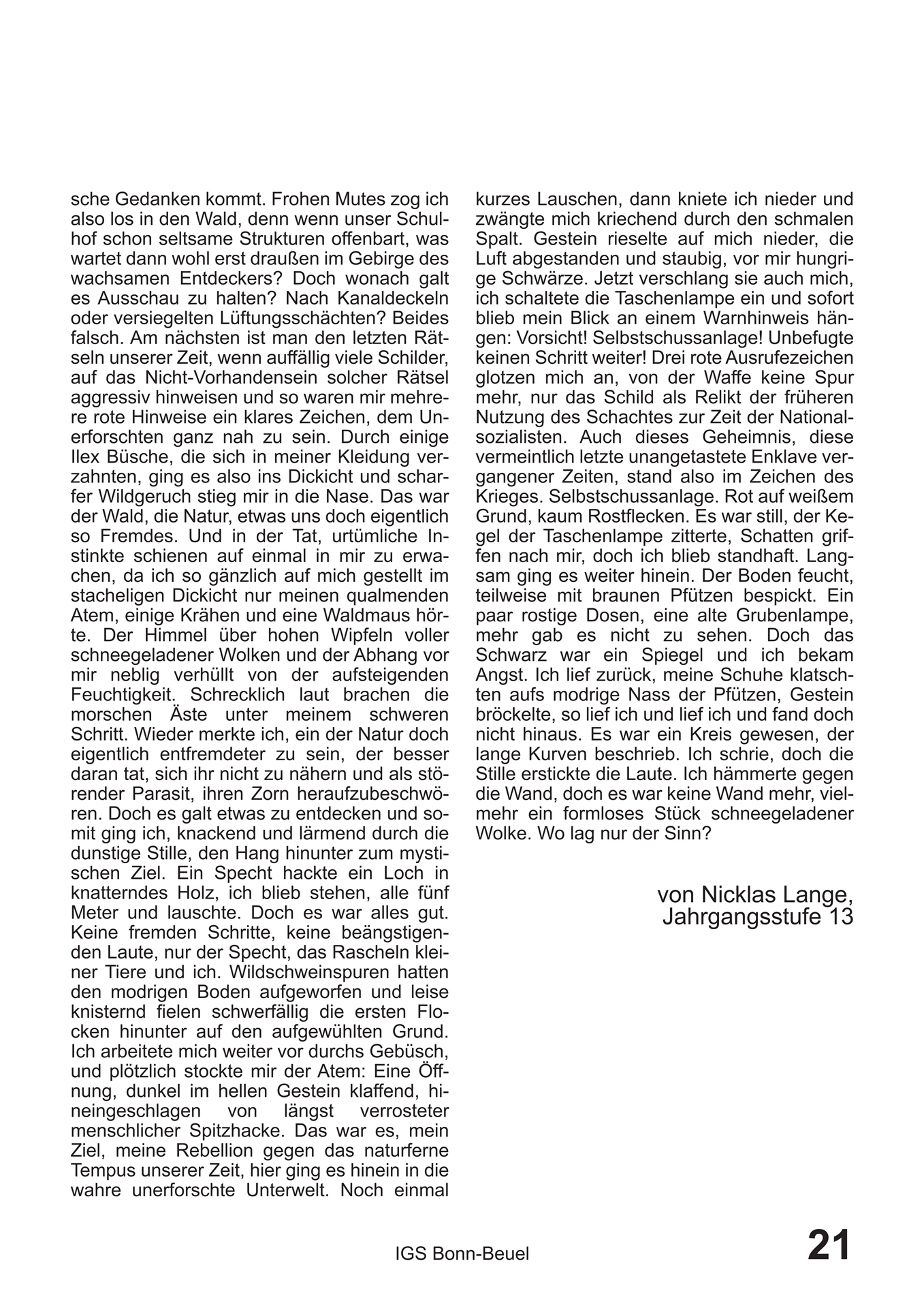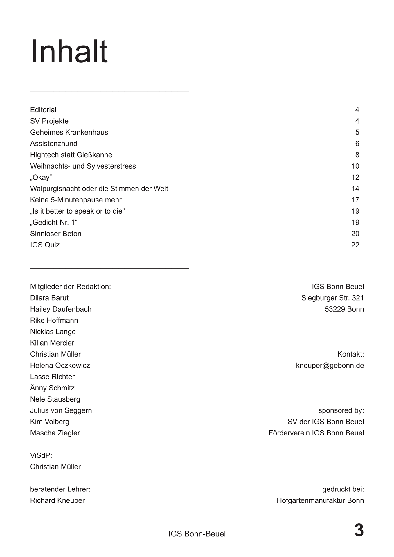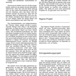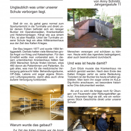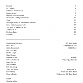 Die interessantesten und zeitgenössischsten Themen haben wieder einmal in ausreichender Menge ihren Weg in die Redaktion gefunden, so dass sie hier nun sortiert und gefiltert in gebündelter Macht auf ihrem Schoß ruhen. Der wunderbare Eyecatcher von Titelbild dieser Ausgabe wurde von Hailey Daufenbach beigesteuert, welcher in harmonischster Art und Weise neugierig auf den Inhalt macht. Hier sind erwähnenswert wohl vor allem der literarisch in diesen Schulmauern einzigartige Walpurgisnacht-Traum, welcher von Nicklas Lange, einem unserer alteingesessensten Redakteure verfasst wurde, sowie der zeichnerisch wie schriftlich brillante Comic „Okay“, von Theresa Oczkowicz. Unter eben angesprochenen Schulmauern kam noch ein Artikel zustande. Denn der alte Bunker, welcher an dieser Schule schon Stoff für einige Legenden bot, eignet sich einfach perfekt für alljährliche Reportagen. Für die jüngere Leserschaft existieren außerdem noch Artikel über die Assistenzhunde, sowie über den Schulacker, welchen anscheinend unser modernes Zeitalter eingeholt hat.