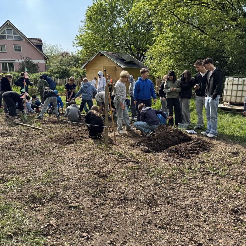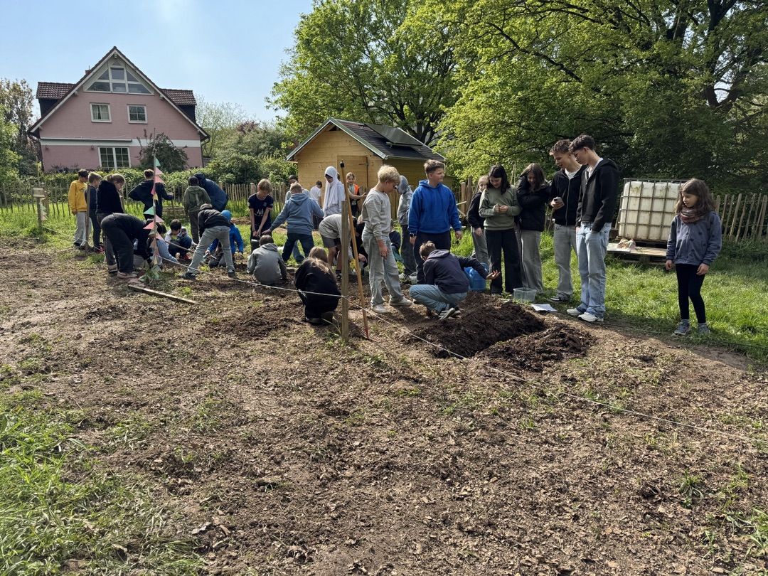 Am Donnerstag, 18.04.2024 wurde auf dem Gemüseacker der IGS fleißig gepflanzt, gesetzt und gesät. Mit der Unterstützung der AckerCoachin Christina Ollesch von Acker e.V. und ihren Lehrpersonen haben die Schüler:innen der Klassen 5B, 5D, 5E und 5F jeweils neun Ackerbeete bepflanzt.